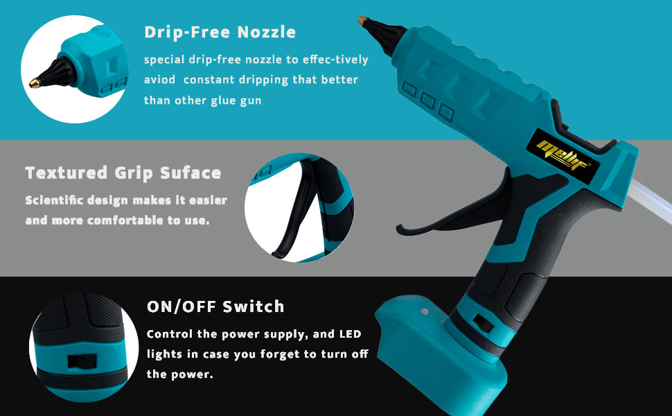 Drip-Free and Safe: Features a copper and insulated nozzle to prevent glue leakage and a lock-off switch to prevent accidental activation.