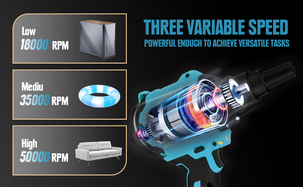 Brushless Powerhouse: Up to 50,000 RPM with three speed settings—cleans dust and debris from computers, desks, window crevices effortlessly.