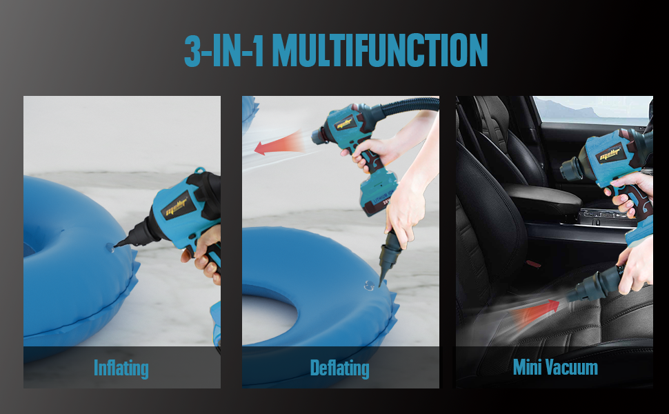 3-in-1 Multi-Tool: Includes 7 accessories—standard nozzles, squeeze-valve inflator, and deflation hose—perfect as a blower, inflator, or mini vacuum.