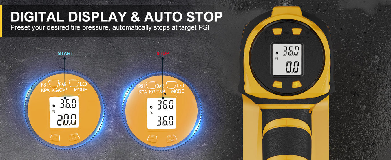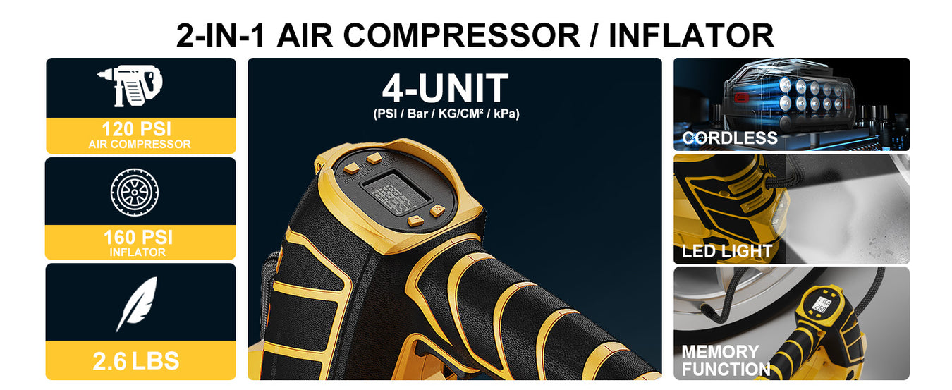 • Portable & Versatile – Only 2.6 lbs, with LED light and full accessory kit for cars, trucks, bikes, balls, and tools.