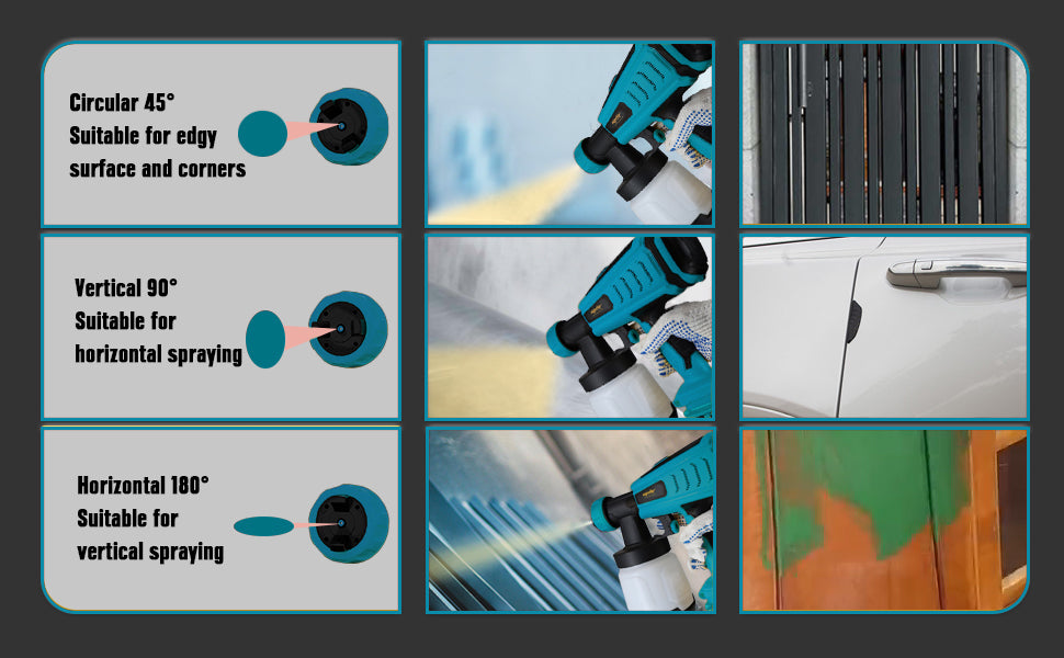 Vielseitige Düsen und Sprühmuster: Ausgestattet mit 3 Düsen (1,0 mm, 1,5 mm, 2,5 mm) und 3 einstellbaren Sprühmustern – horizontal, vertikal und kreisförmig – für verschiedene Projekte wie Möbel, Autos, Zäune und Innenwände.