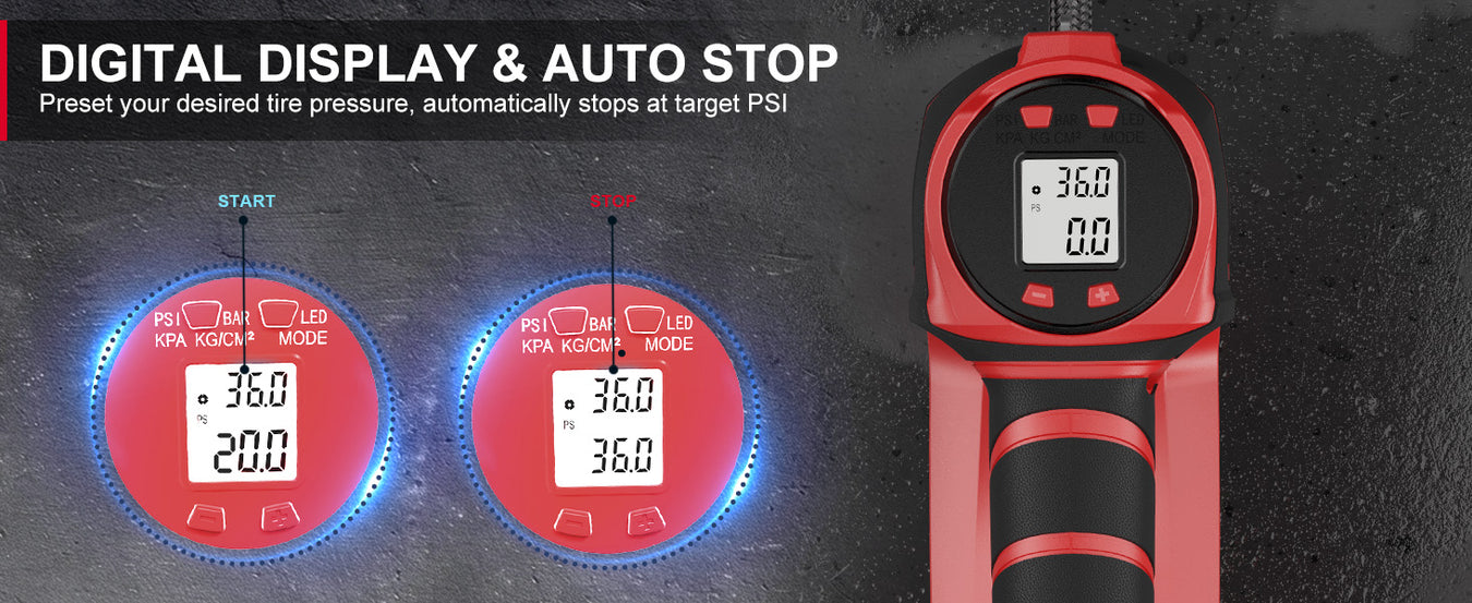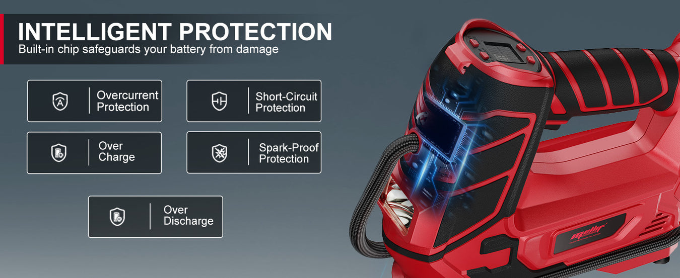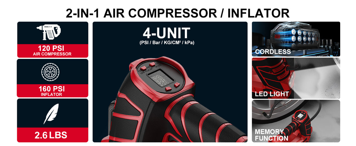 • Portable & Versatile – Only 2.6 lbs, with LED light and full accessory kit for cars, trucks, bikes, balls, and tools.