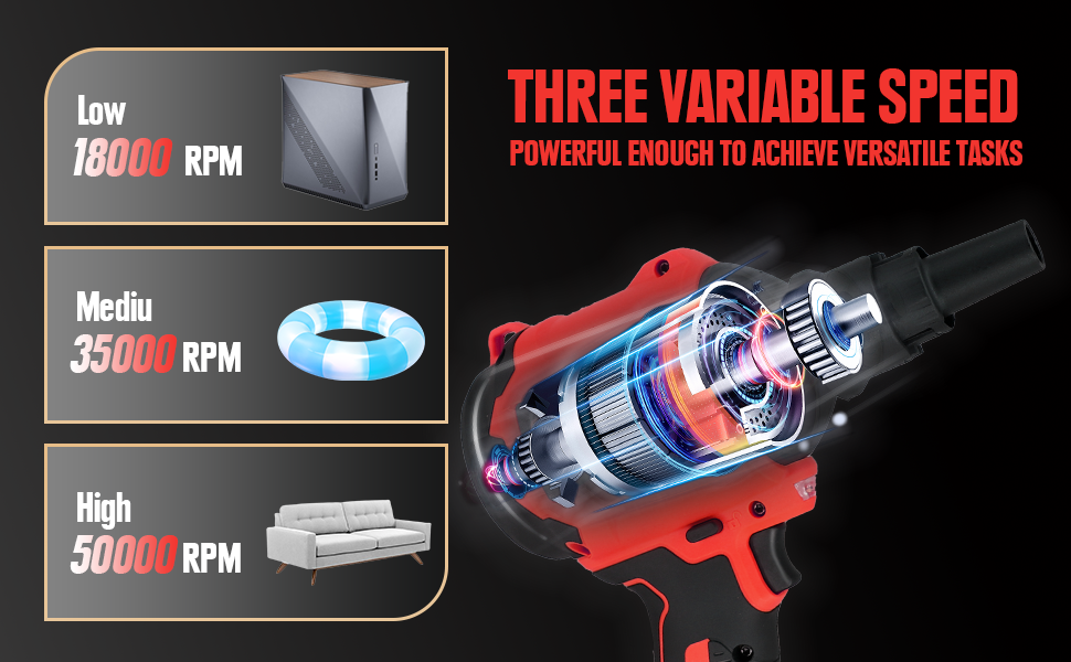 • Contrôle à 3 vitesses – Basculez entre les vitesses basse, moyenne et élevée pour le nettoyage, le gonflage ou le dégonflage.