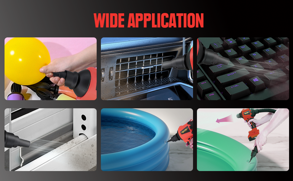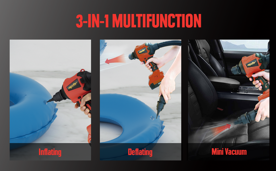 • Fonction 3 en 1 – Nettoie, gonfle et aspire avec les buses et le tuyau inclus.