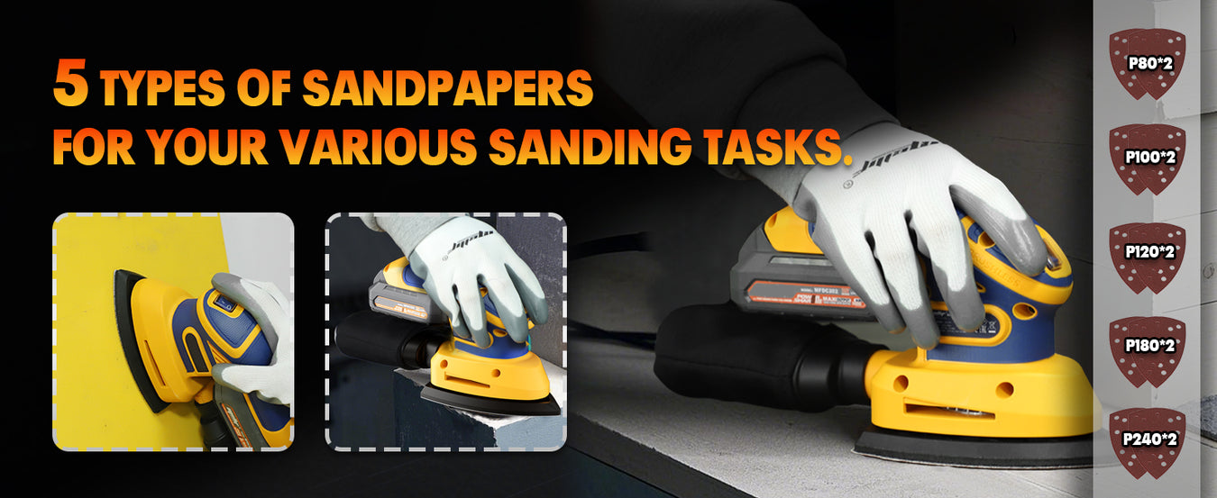 - 10 feuilles abrasives incluses – Grains P80 à P240 avec changement rapide par crochet et boucle