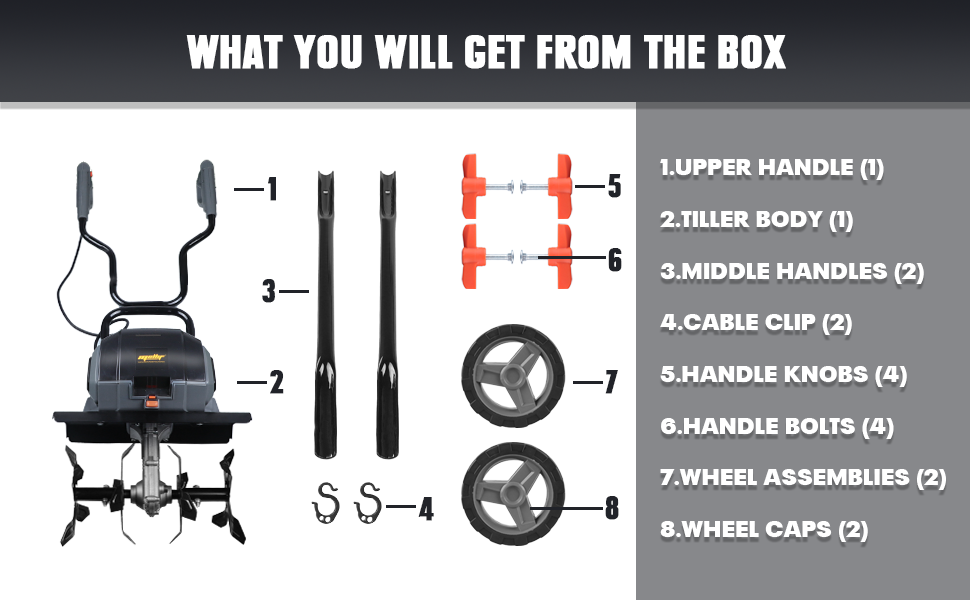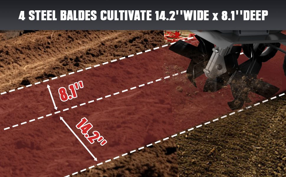 14.2" tilling width & 8.7" depth with 4×4 blades (8.1" diameter) for fast soil digging & grass reseeding. -